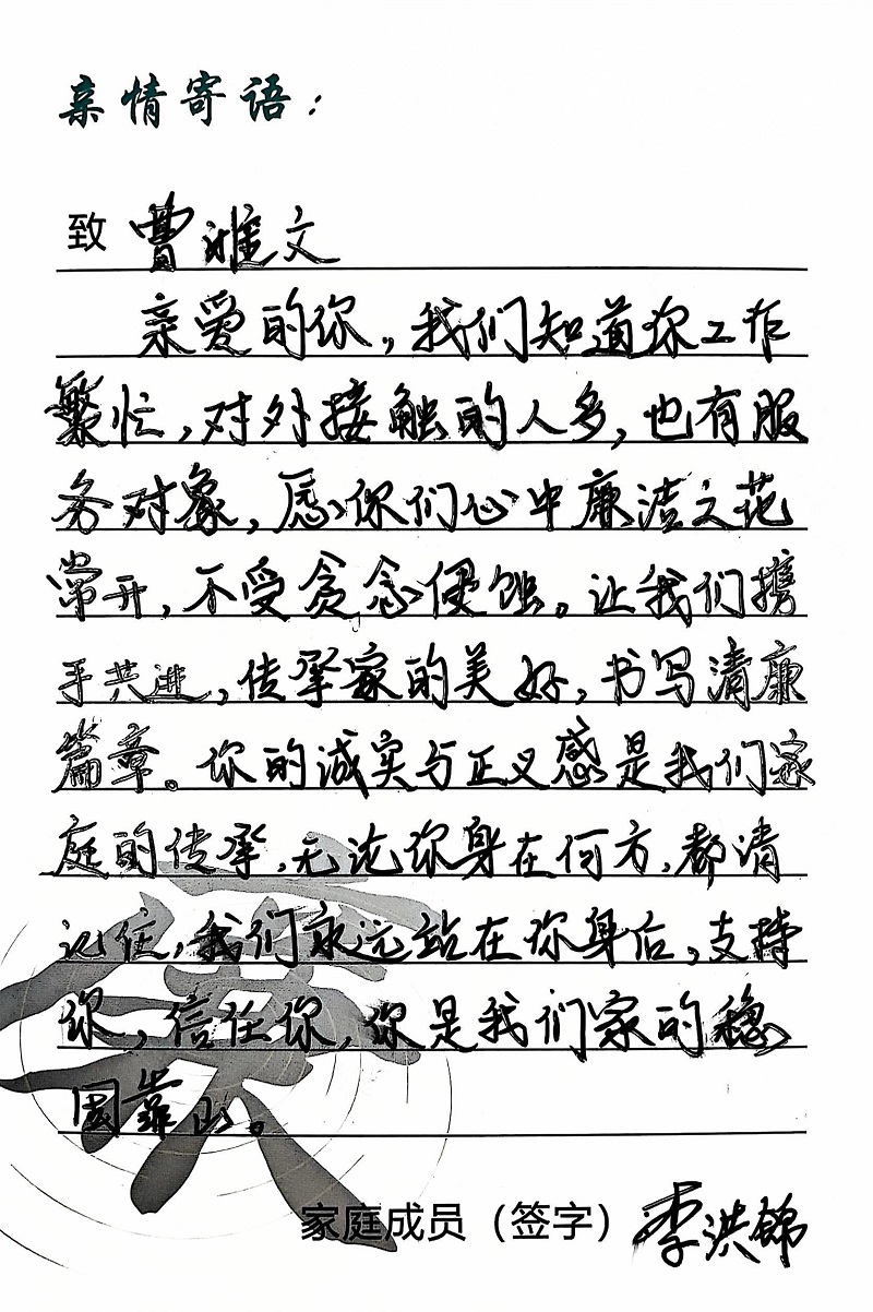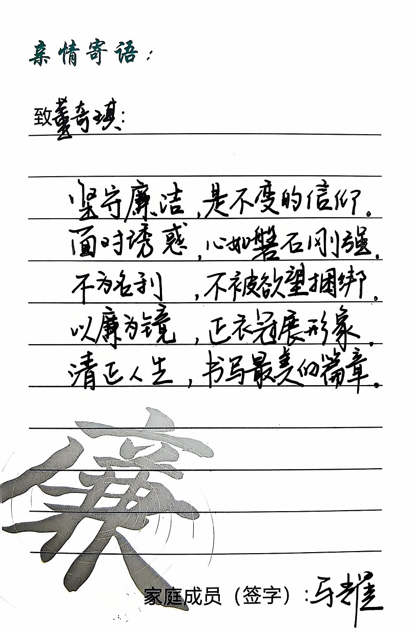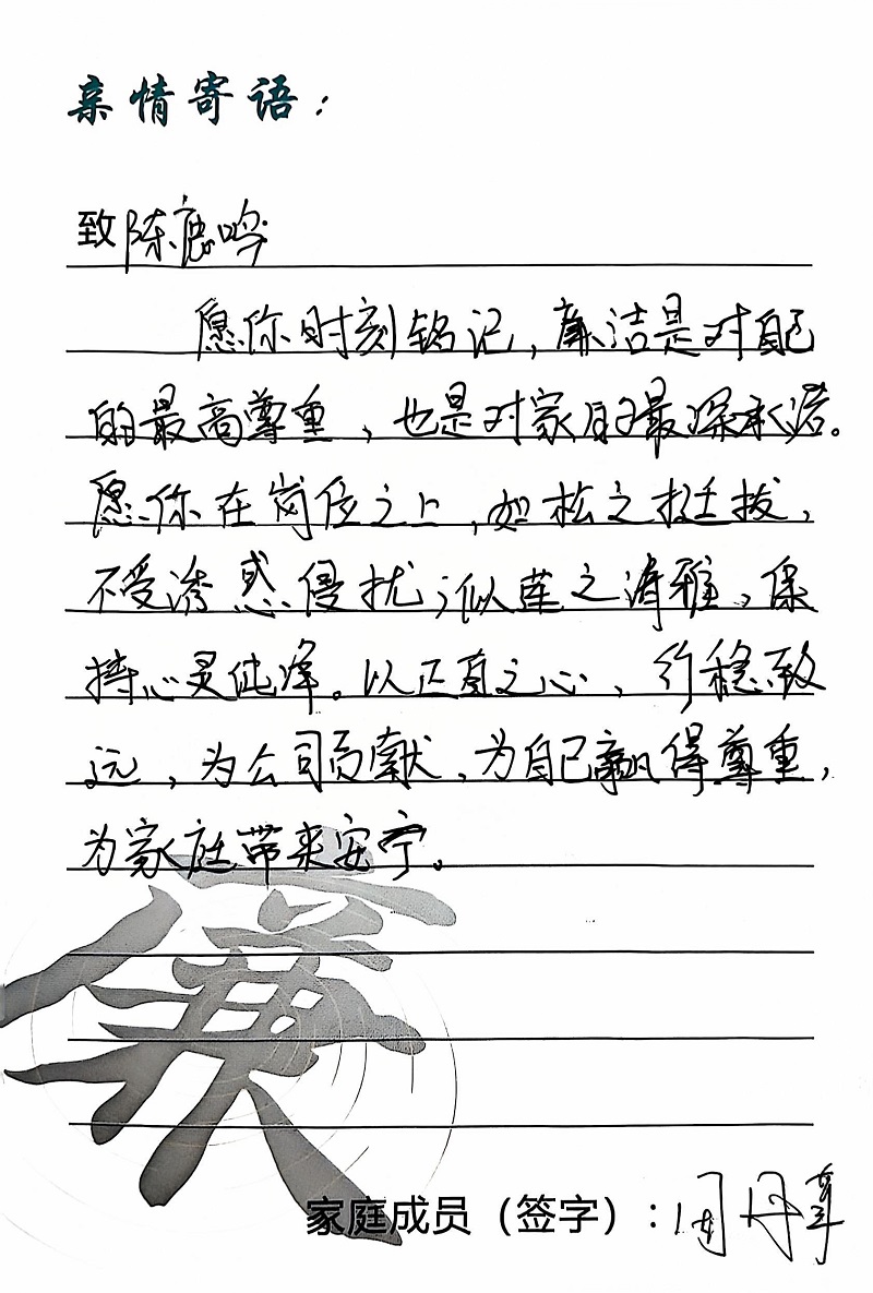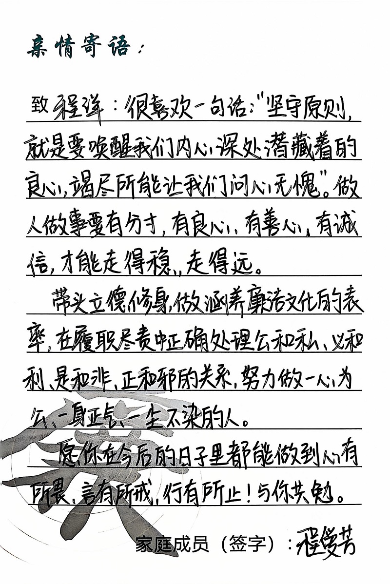 為深入學習黨的二十大精神,貫徹落實習近平總書記關(guān)于注重家庭家教家風建設(shè)的重要論述,營造公司崇廉、尚廉、踐廉、助廉的良好氛圍,城投公司組織開展了“家滿清風·廉潤城投”廉潔文化活動;顒娱_展以來,共征集廉政寄語210余條。經(jīng)各部門、子公司推薦,城投公司相關(guān)部門審核,評選出優(yōu)秀廉潔寄語43條,F(xiàn)將優(yōu)秀廉政寄語分批次進行展播,快來一起欣賞吧!