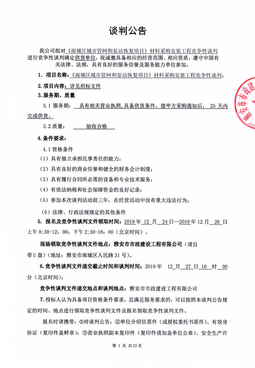 《雨城區(qū)城市管網(wǎng)和泵站恢復(fù)項(xiàng)目》材料采購安裝工程競爭性談判公告