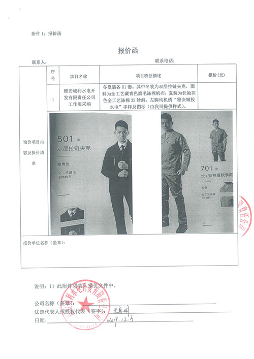 雅安城利水電開發(fā)有限責(zé)任公司工作服采購(gòu)詢價(jià)函