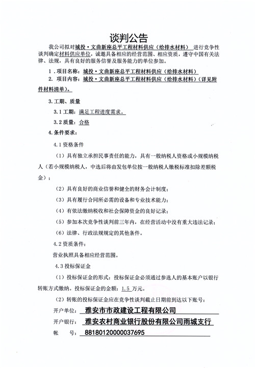 市政公司城投·文曲新座總平工程材料供應(yīng)(給排水材料)競爭性談判公告