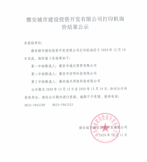 雅安城市建設投資開發(fā)有限公司打印機詢價結果公示