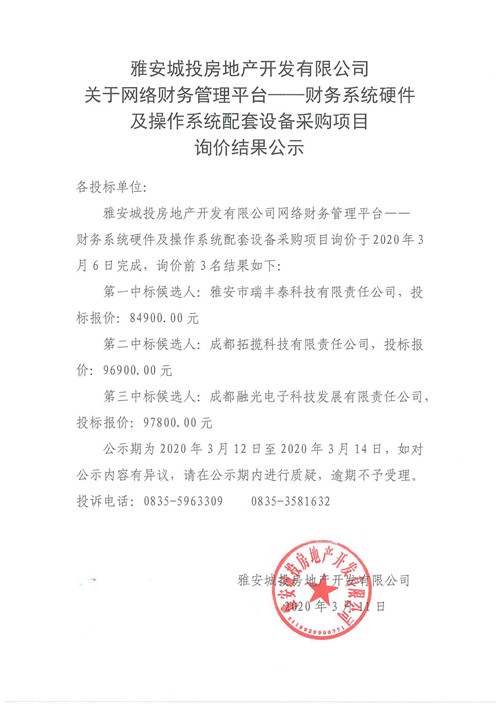 城投房地產(chǎn)公司關(guān)于網(wǎng)絡(luò)財(cái)務(wù)管理平臺——財(cái)務(wù)系統(tǒng)硬件及操作系統(tǒng)配套設(shè)備采購項(xiàng)目詢價(jià)結(jié)果公示