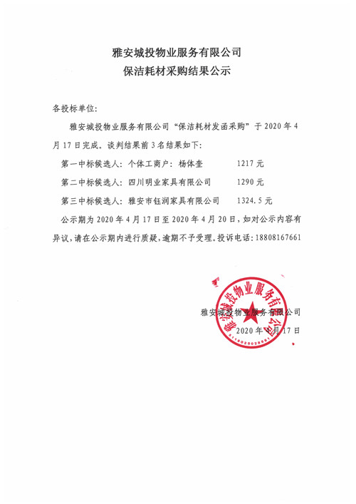 城投物業(yè)公司保潔耗材采購結(jié)果公示