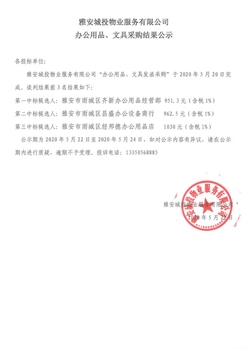 城投物業(yè)公司辦公用品、文具采購結(jié)果公示