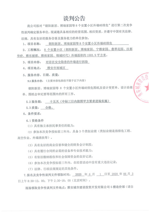 城投公司“朝陽新居、博瑞家園等8個(gè)安置小區(qū)外墻磚排危”競(jìng)爭(zhēng)性談判公告(第二次)