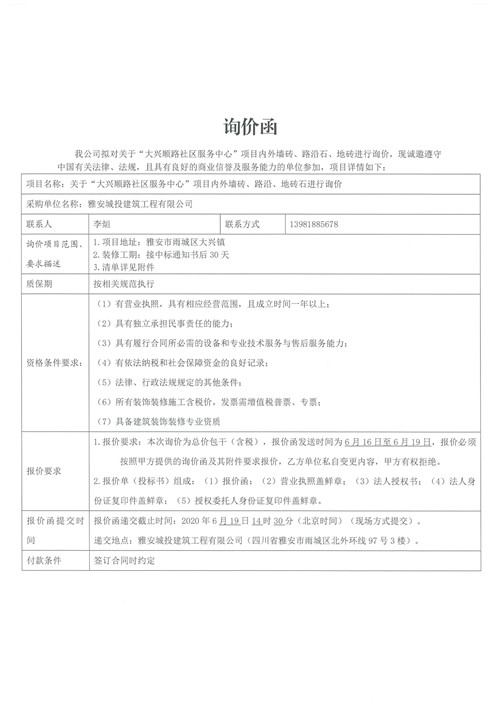 城投建工“大興順路社區(qū)服務(wù)中心”項(xiàng)目內(nèi)外墻磚、路沿石、地磚詢價(jià)函