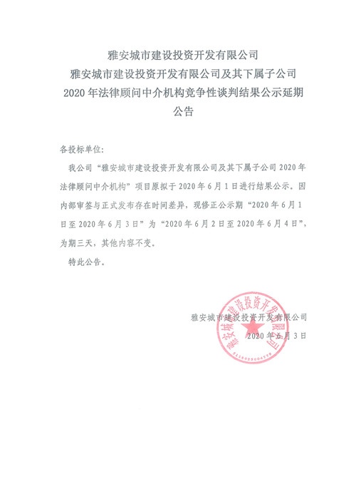 雅安城市建設(shè)投資開(kāi)發(fā)有限公司及其下屬子公司2020年法律顧問(wèn)中介機(jī)構(gòu)競(jìng)爭(zhēng)性談判結(jié)果公示延期公告