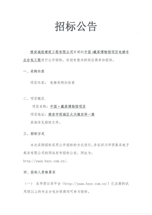 城投建工公司中國(guó)·藏茶博物館項(xiàng)目電梯專(zhuān)業(yè)分包工程招標(biāo)公告