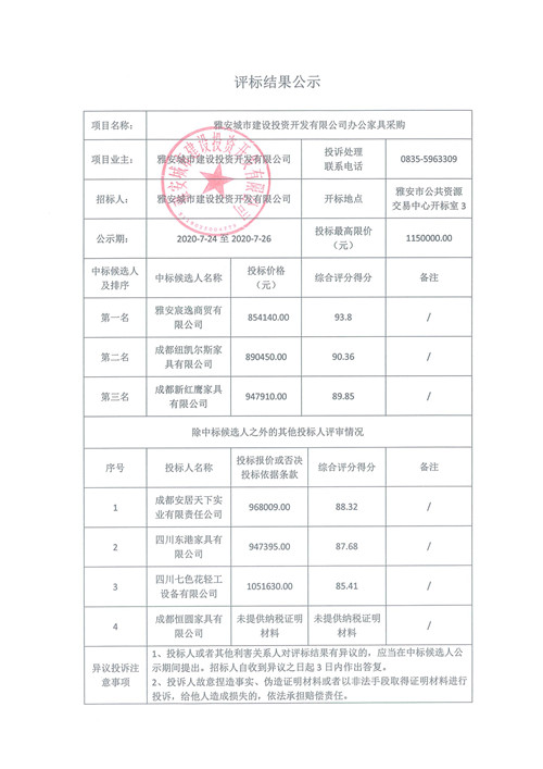 雅安城市建設(shè)投資開發(fā)有限公司辦公家具采購評標結(jié)果公示