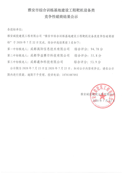 城投建工公司雅安市綜合訓(xùn)練基地建設(shè)工程靶機(jī)設(shè)備類競(jìng)爭(zhēng)性磋商結(jié)果公示
