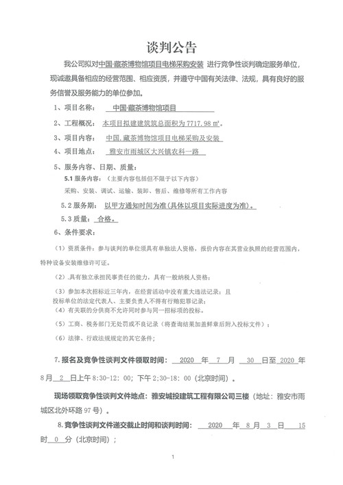城投建工公司中國·藏茶博物館項(xiàng)目電梯采購安裝競(jìng)爭(zhēng)性談判公告