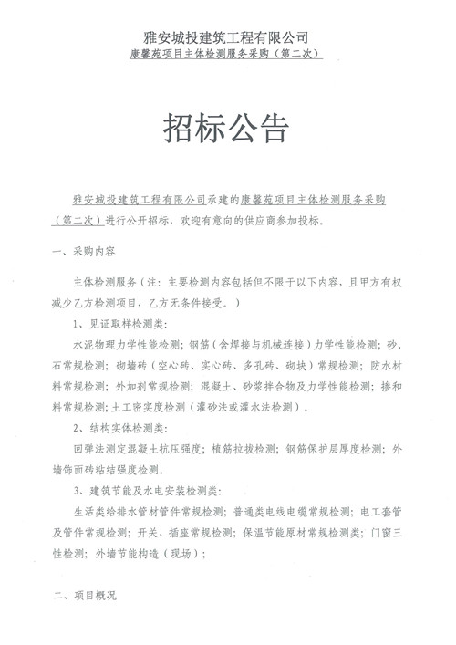 城投建工公司康馨苑項目主體檢測服務招標公告(第二次)