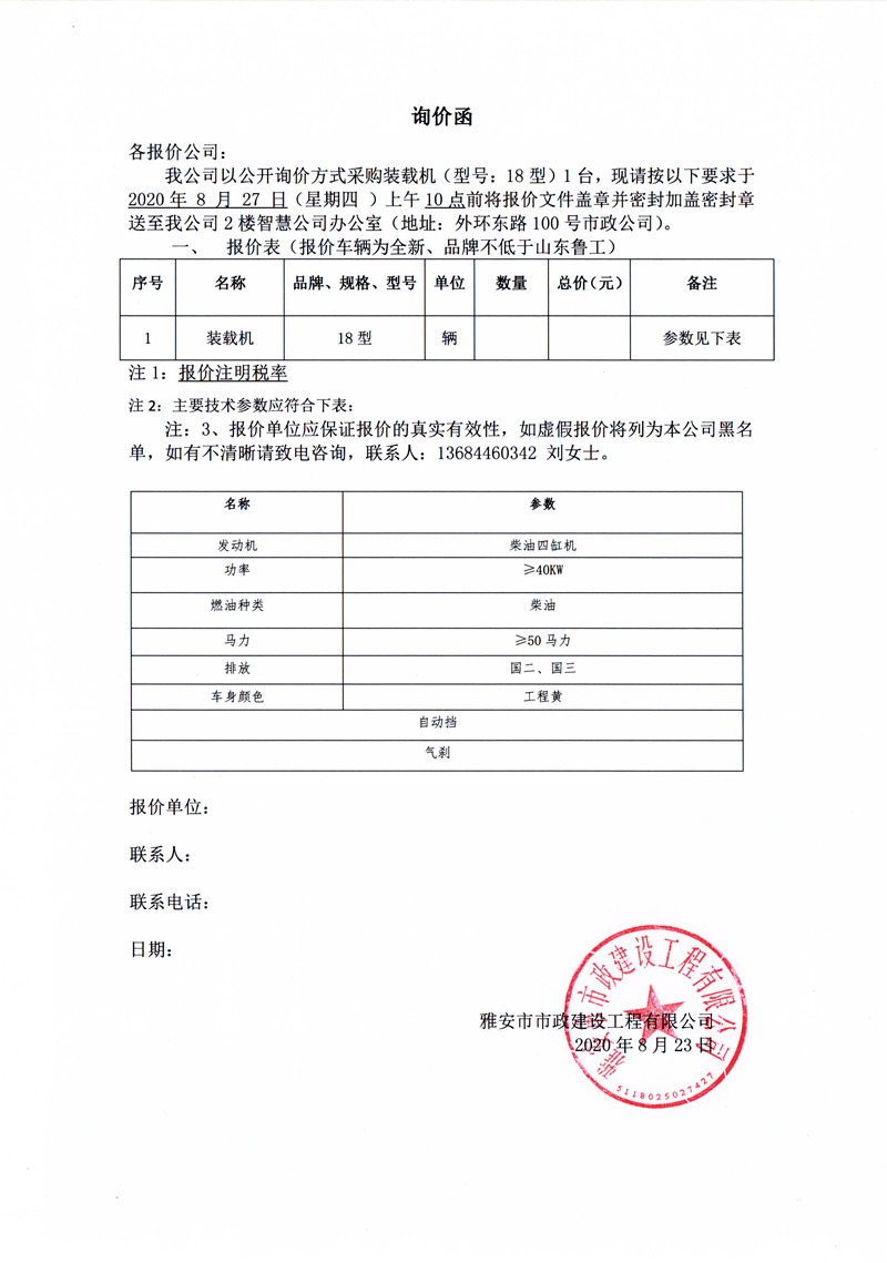 雅安市市政建設工程有限公司采購裝載機(型號:18型)詢價函