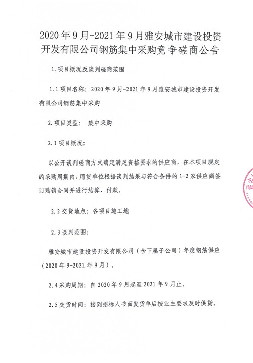 2020年9月-2021年9月雅安城市建設(shè)投資開發(fā)有限公司鋼筋集中采購(gòu)競(jìng)爭(zhēng)磋商公告
