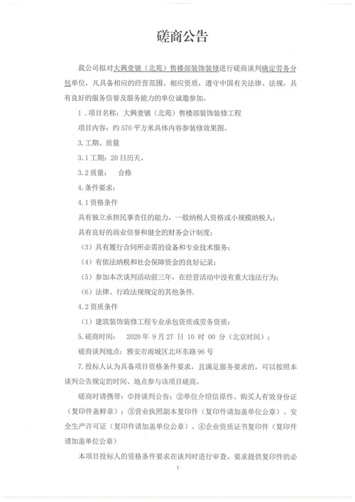 城投建工大興壹號(北苑)售樓部裝飾裝修磋商公告