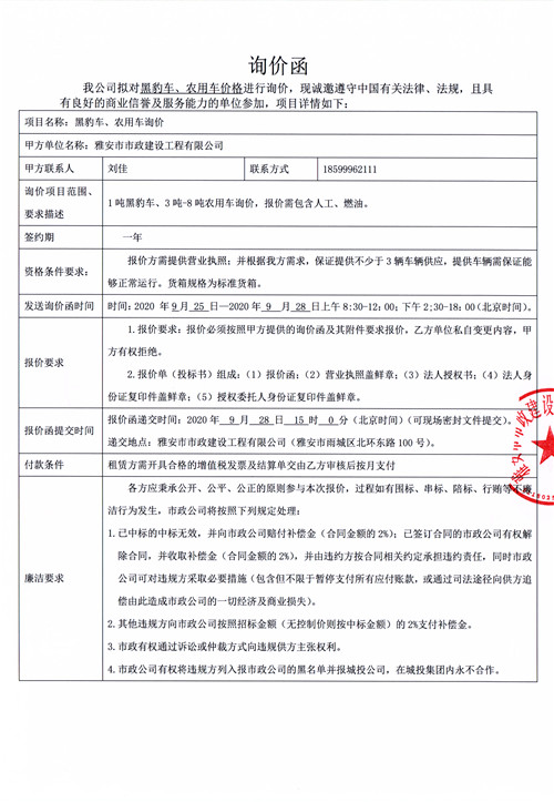 市政公司黑豹車、農(nóng)用車、雙橋車價(jià)格詢價(jià)函