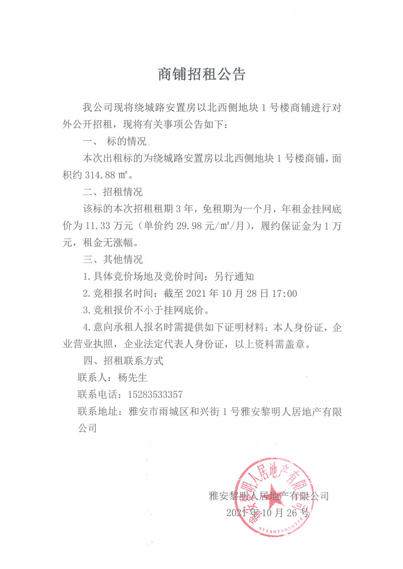 繞城路安置房以北西側(cè)地塊1號樓商鋪招租公告