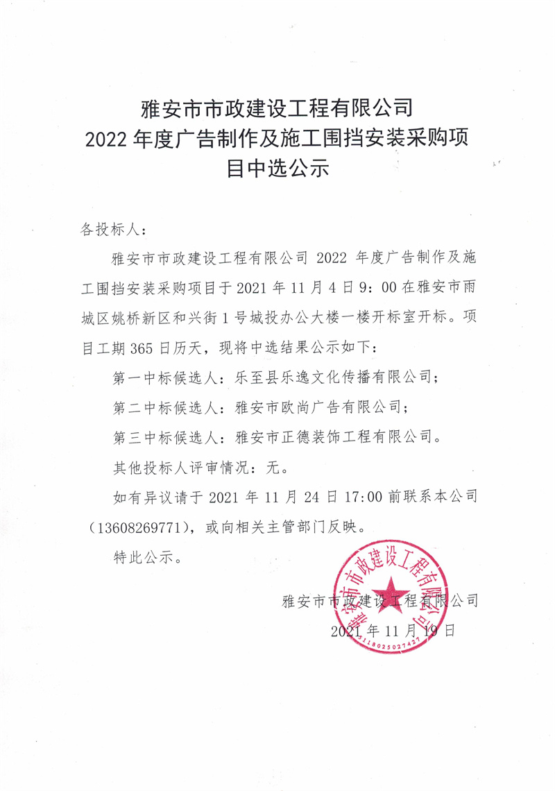 雅安市市政建設工程有限公司2022年度廣告制作及施工圍擋安裝采購項目中選公示
