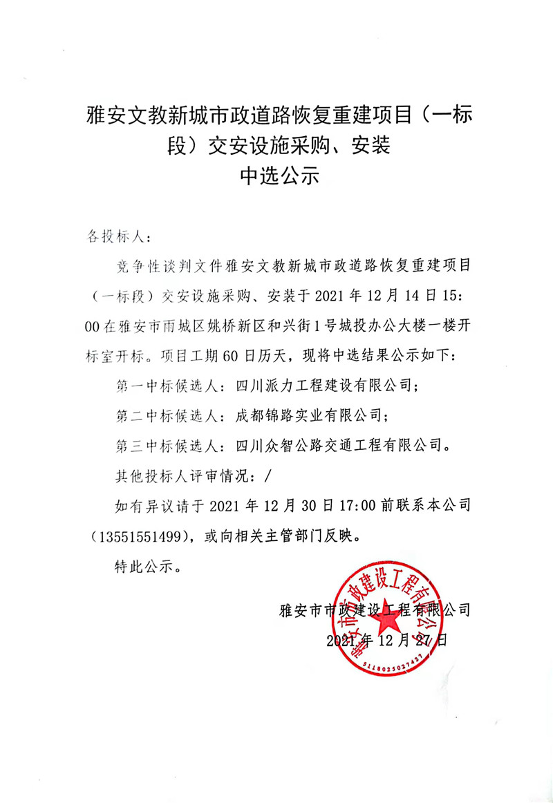 雅安文教新城市政道路恢復(fù)重建項(xiàng)目(一標(biāo)段)交安設(shè)施采購(gòu)、安裝中選公示