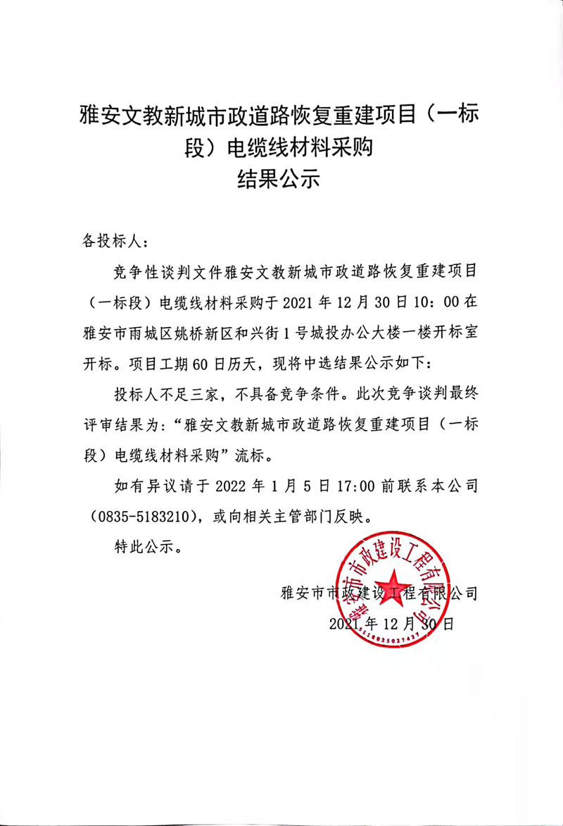 雅安文教新城市政道路恢復(fù)重建項目(一標段)電纜線材料采購競爭性談判公告