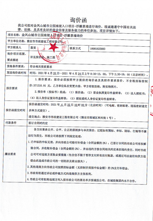 金鳳山城市公園南坡入口項(xiàng)目-浮雕景墻詢價函