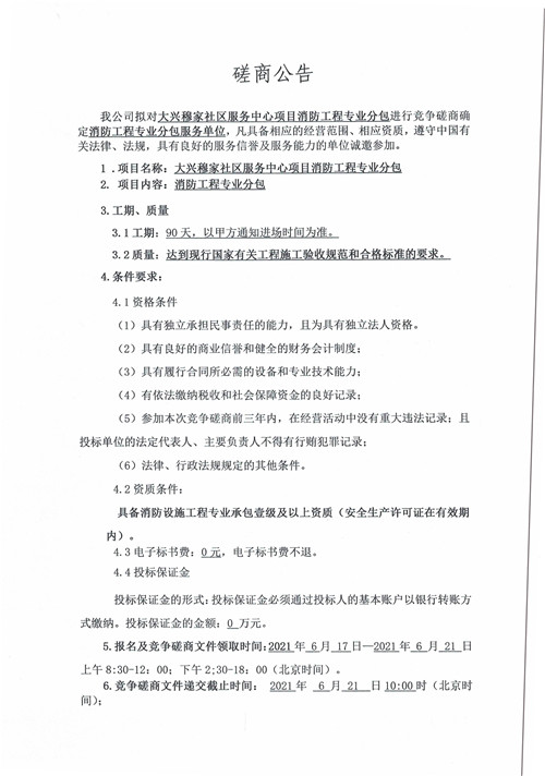 城投建工公司大興穆家社區(qū)服務(wù)中心項目消防工程專業(yè)分包競爭性磋商公告