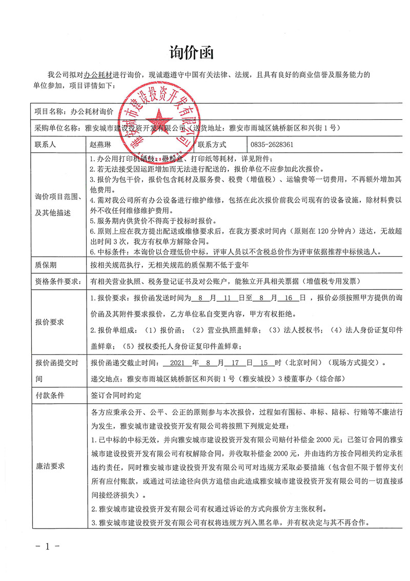城投公司辦公耗材詢價函
