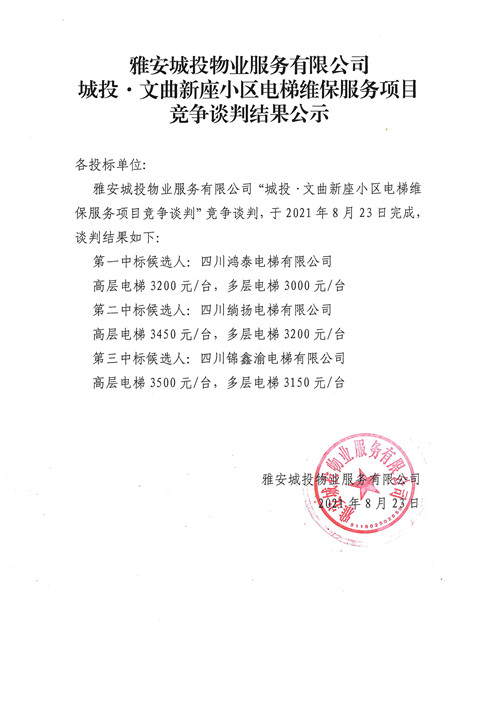 城投物業(yè)公司城投·文曲新座小區(qū)電梯維保服務項目競爭談判結果公示