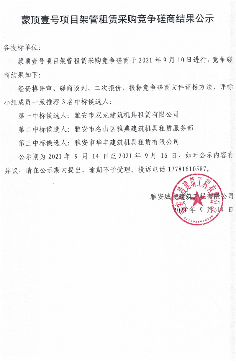 蒙頂壹號項目架管租賃采購競爭磋商結(jié)果公示