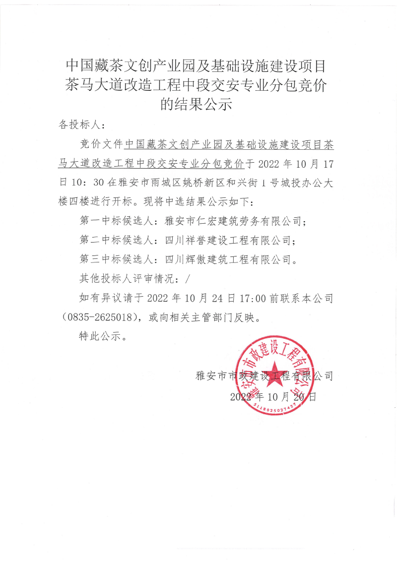 中國(guó)藏茶文創(chuàng)產(chǎn)業(yè)園及基礎(chǔ)設(shè)施建設(shè)項(xiàng)目茶馬大道改造工程中段交安專(zhuān)業(yè)分包競(jìng)價(jià)的結(jié)果公示