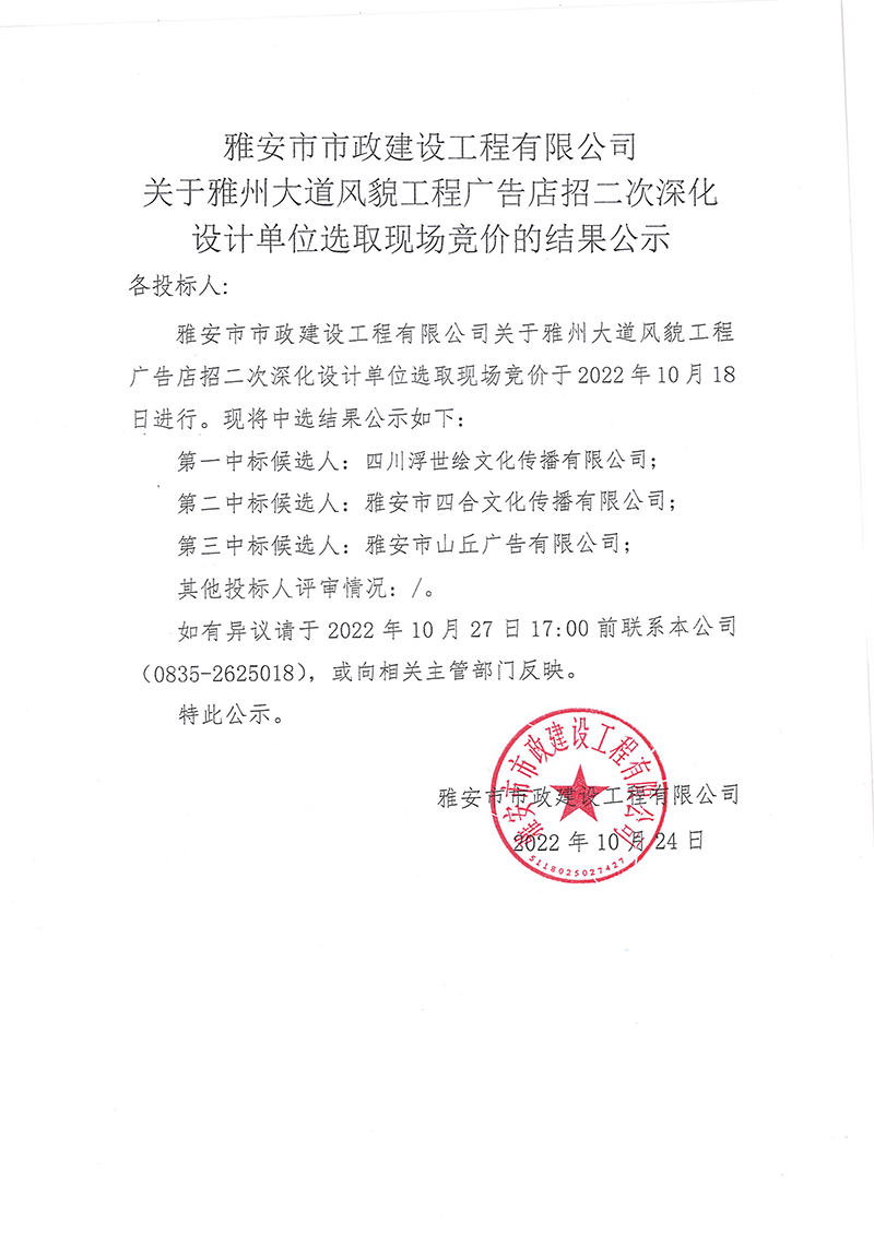 雅安市市政建設工程有限公司關于雅州大道風貌工程廣告店招二次深化設計單位選取現場競價的結果公示