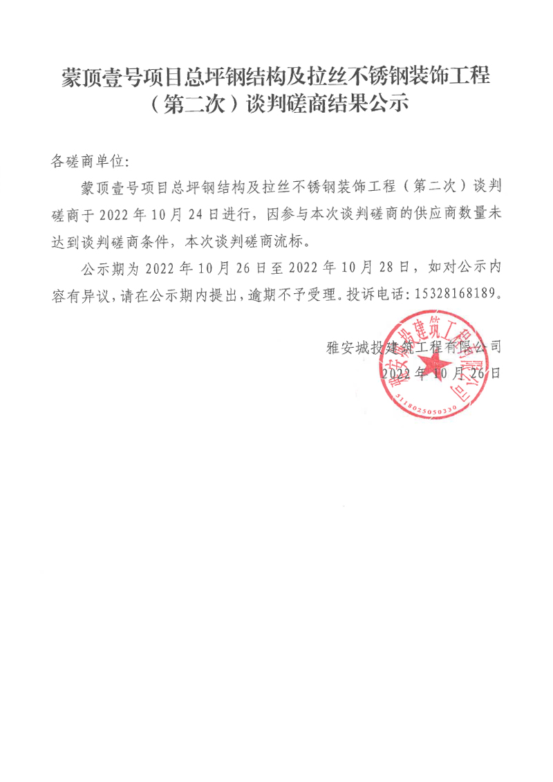 蒙頂壹號項目總坪鋼結(jié)構(gòu)及拉絲不銹鋼裝飾工程(第二次)談判磋商結(jié)果公示
