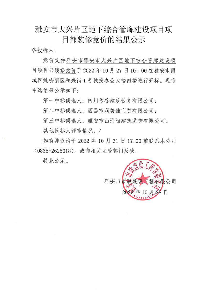 雅安市大興片區(qū)地下綜合管廊建設項目項目部裝修競價的結果公示