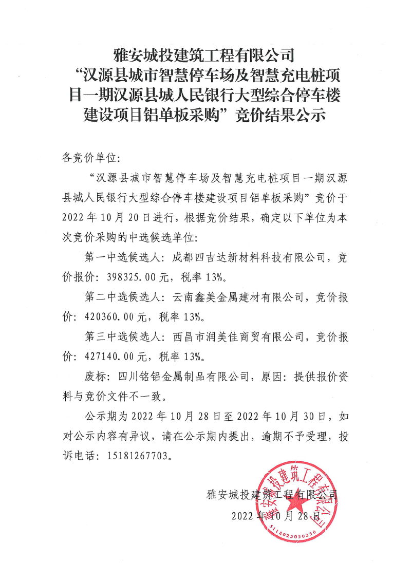漢源縣城市智慧停車場及智慧充電樁項目一期漢源縣城人民銀行大型綜合樓停車樓建設項目鋁單板材料采購競價結(jié)果公示
