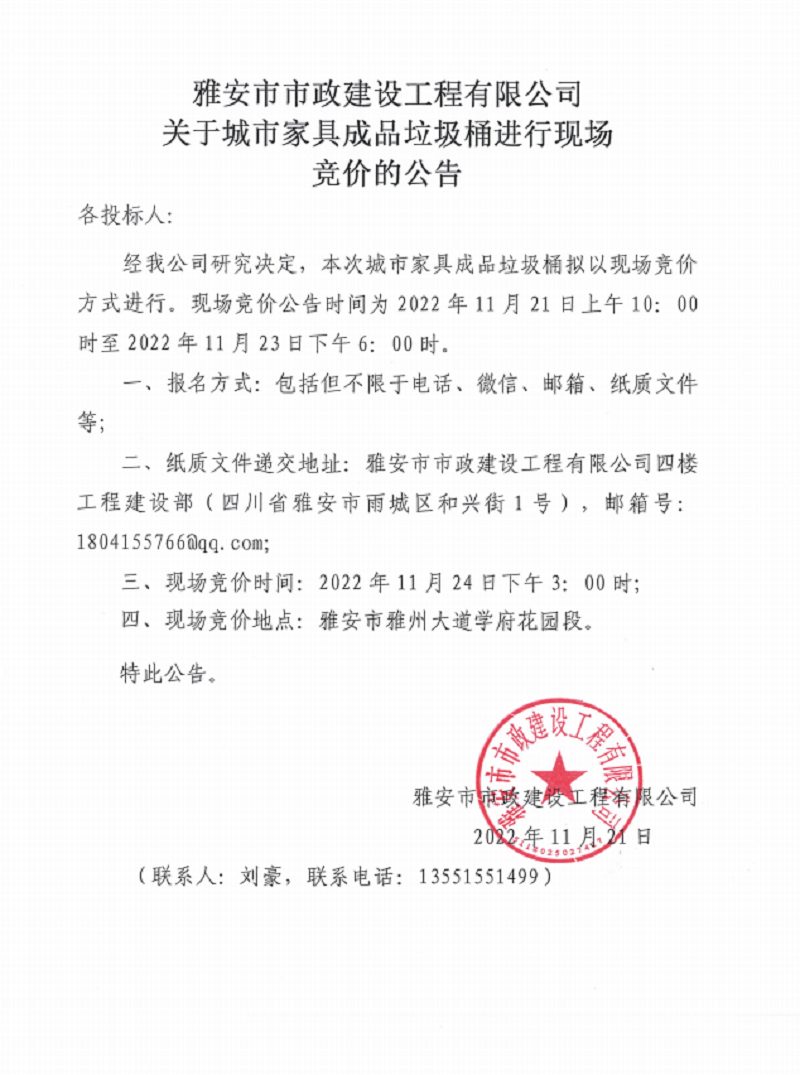 雅安市市政建設(shè)工程有限公司關(guān)于城市家具成品垃圾桶進(jìn)行現(xiàn)場(chǎng)競(jìng)價(jià)的公告