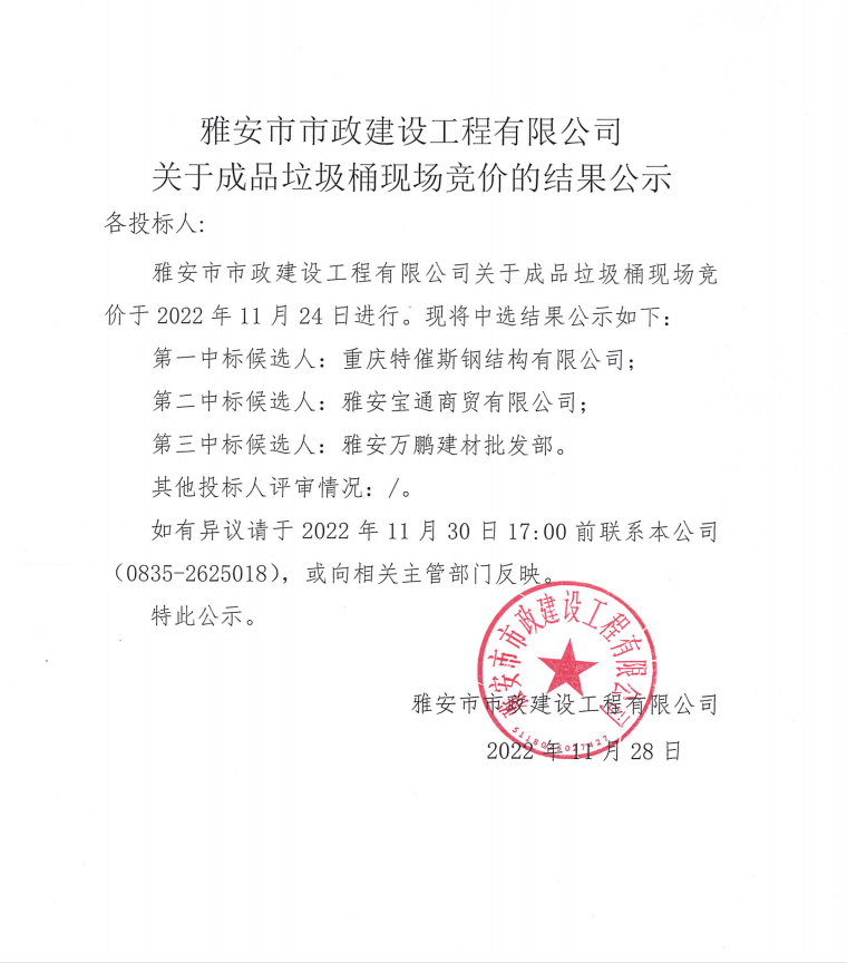 雅安市市政建設(shè)工程有限公司關(guān)于成品垃圾桶現(xiàn)場競價(jià)的結(jié)果公示