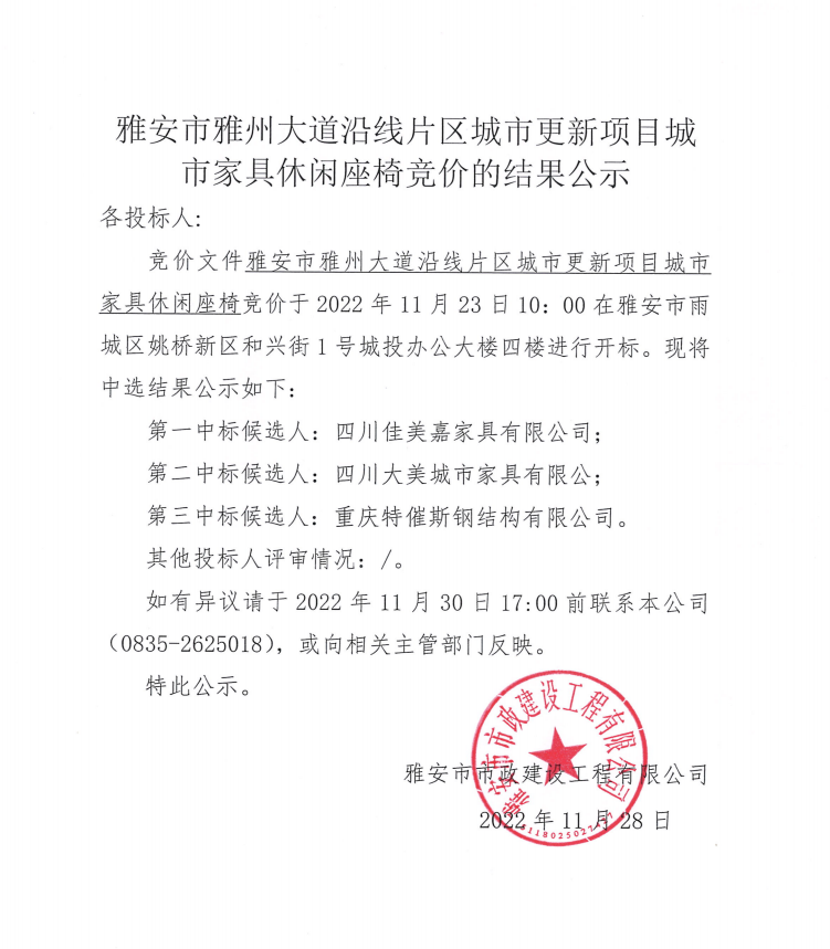 雅安市雅州大道沿線片區(qū)城市更新項目城市家具休閑座椅競價的結果公示