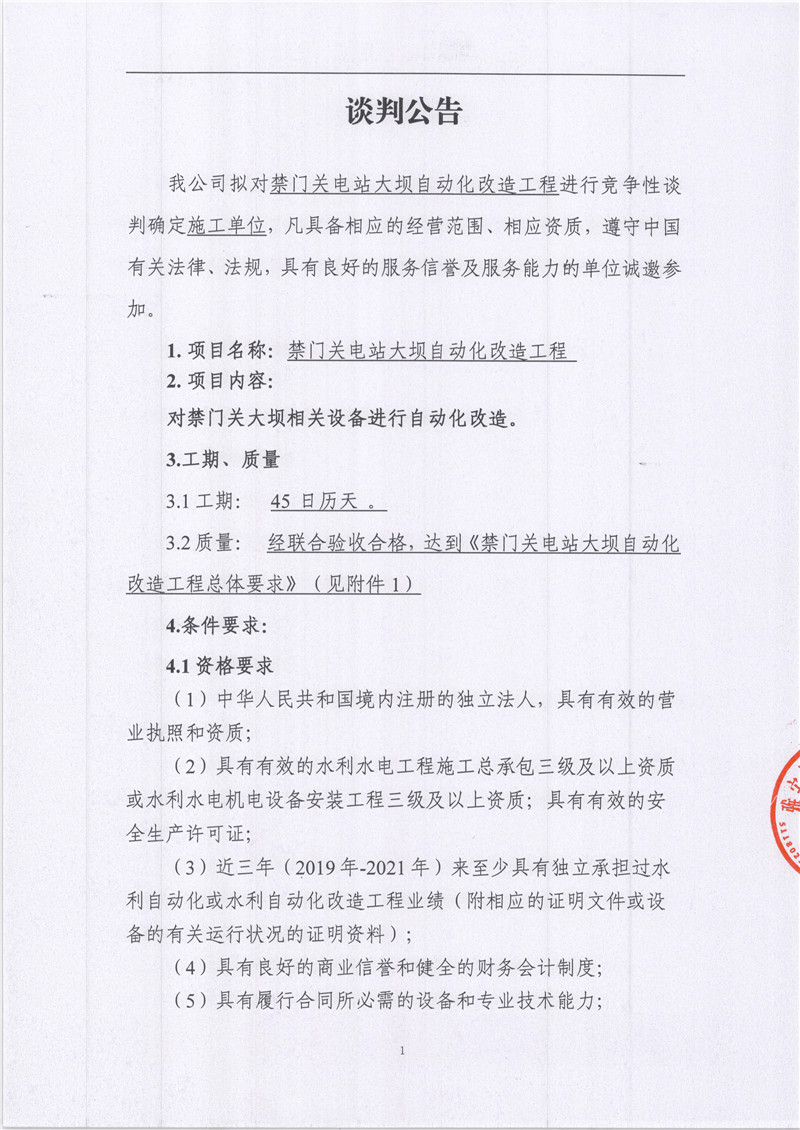 雅安城利水電公司禁門關(guān)電站大壩自動(dòng)化改造工程競爭性談判公告