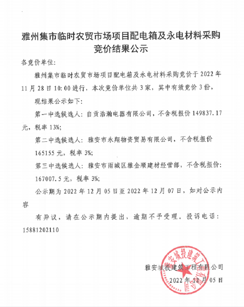 雅州集市臨時(shí)農(nóng)貿(mào)市場項(xiàng)目配電箱及永電材料采購競價(jià)結(jié)果公示