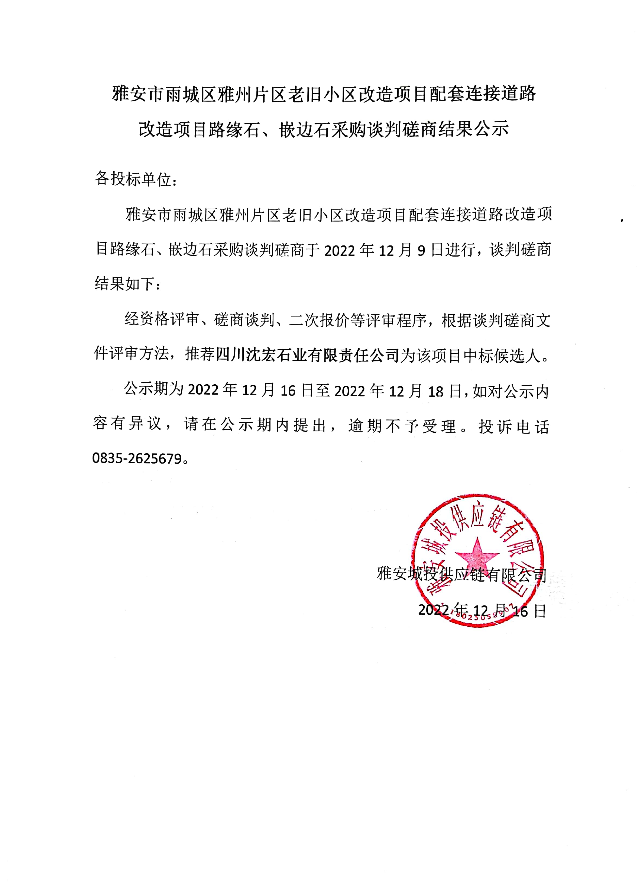 雅安市雨城區(qū)雅州片區(qū)老舊小區(qū)改造項目配套連接道路改造項目路緣石、嵌邊石采購談判磋商結(jié)果公示