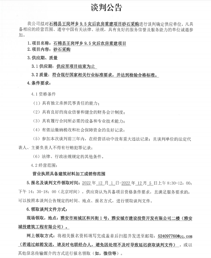 石棉縣王崗坪鄉(xiāng)9.5災(zāi)后農(nóng)房重建項(xiàng)目砂石采購(gòu)談判公告