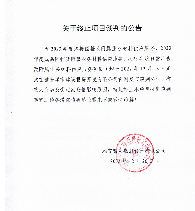 關(guān)于終止2023年度焊接圍擋及附屬業(yè)務(wù)材料、2023年度成品圍擋及附屬業(yè)務(wù)材料、2023年度日常廣告及附屬業(yè)務(wù)材料的供應(yīng)服務(wù)項目談判的公告