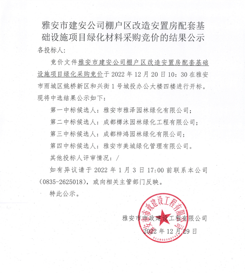 雅安市建安公司棚戶區(qū)改造安置房配套基礎(chǔ)設(shè)施項目綠化材料采購競價結(jié)果公示
