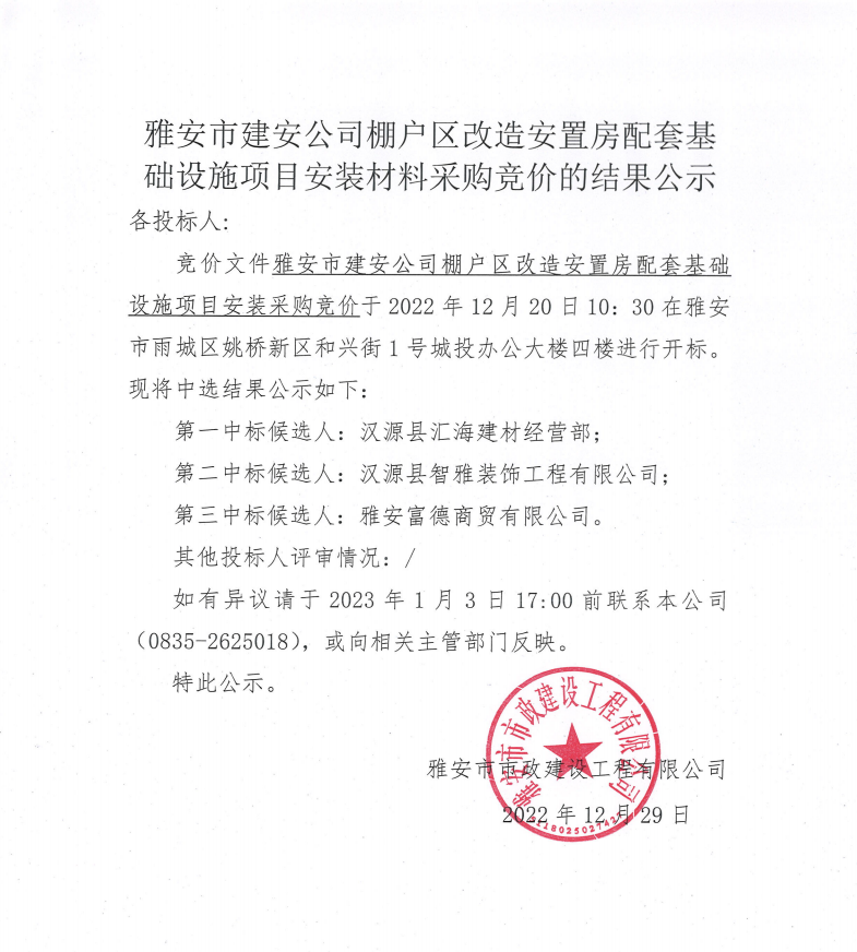 雅安市建安公司棚戶區(qū)改造安置房配套基礎(chǔ)設(shè)施項(xiàng)目安裝材料采購競價(jià)結(jié)果公示