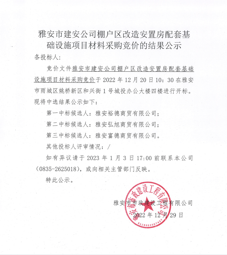 雅安市建安公司棚戶區(qū)改造安置房配套基礎(chǔ)設(shè)施項(xiàng)目材料采購(gòu)競(jìng)價(jià)結(jié)果公示
