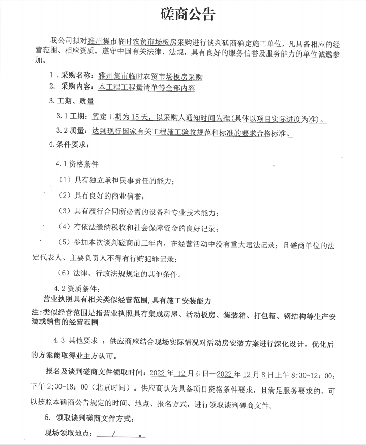 雅州集市臨時(shí)農(nóng)貿(mào)市場(chǎng)板房采購磋商公告