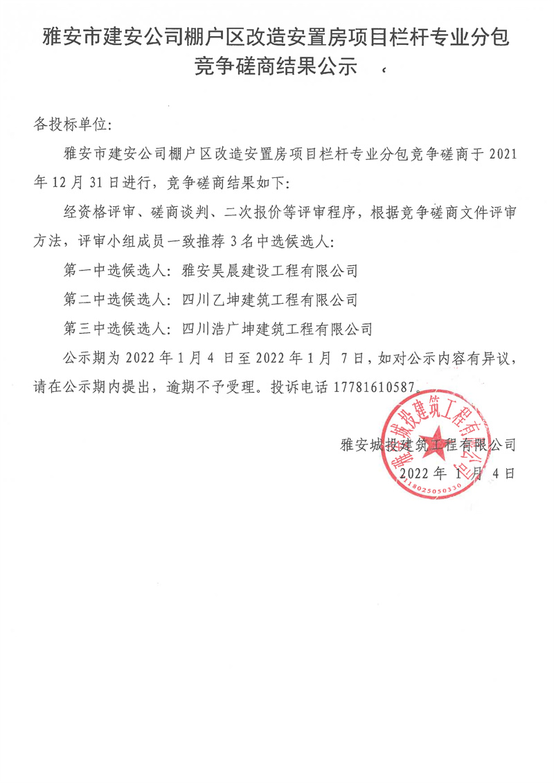 雅安市建安公司棚戶區(qū)改造安置房項(xiàng)目欄桿專業(yè)分包競(jìng)爭(zhēng)磋商結(jié)果公示