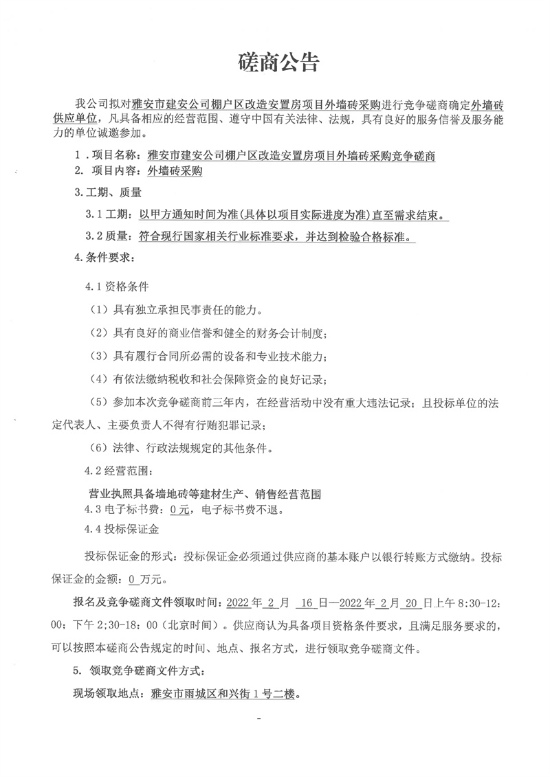 雅安市建安公司棚戶區(qū)改造安置房項(xiàng)目外墻磚采購競(jìng)爭(zhēng)磋商公告