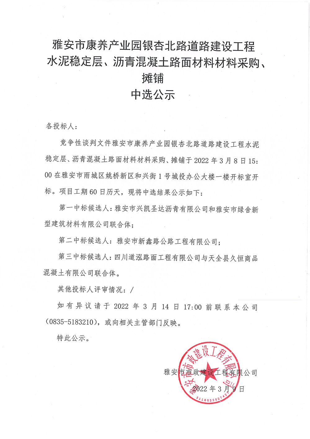 雅安市康養(yǎng)產(chǎn)業(yè)園銀杏北路道路建設(shè)工程 水泥穩(wěn)定層、瀝青混凝土路面材料材料采購、攤鋪中選公示