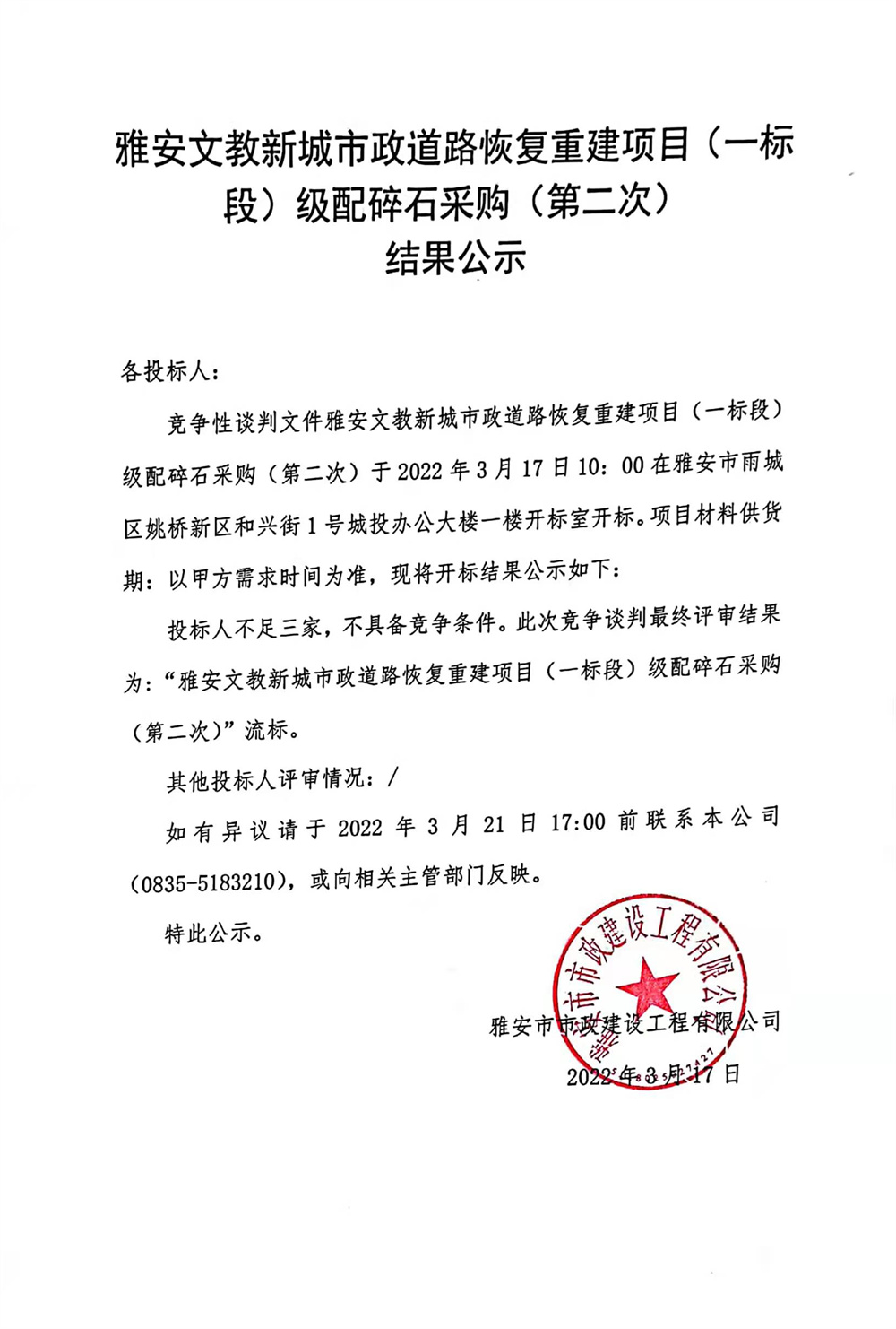 雅安文教新城市政道路恢復(fù)重建項(xiàng)目(一標(biāo)段)級(jí)配碎石采購(第二次)結(jié)果公示